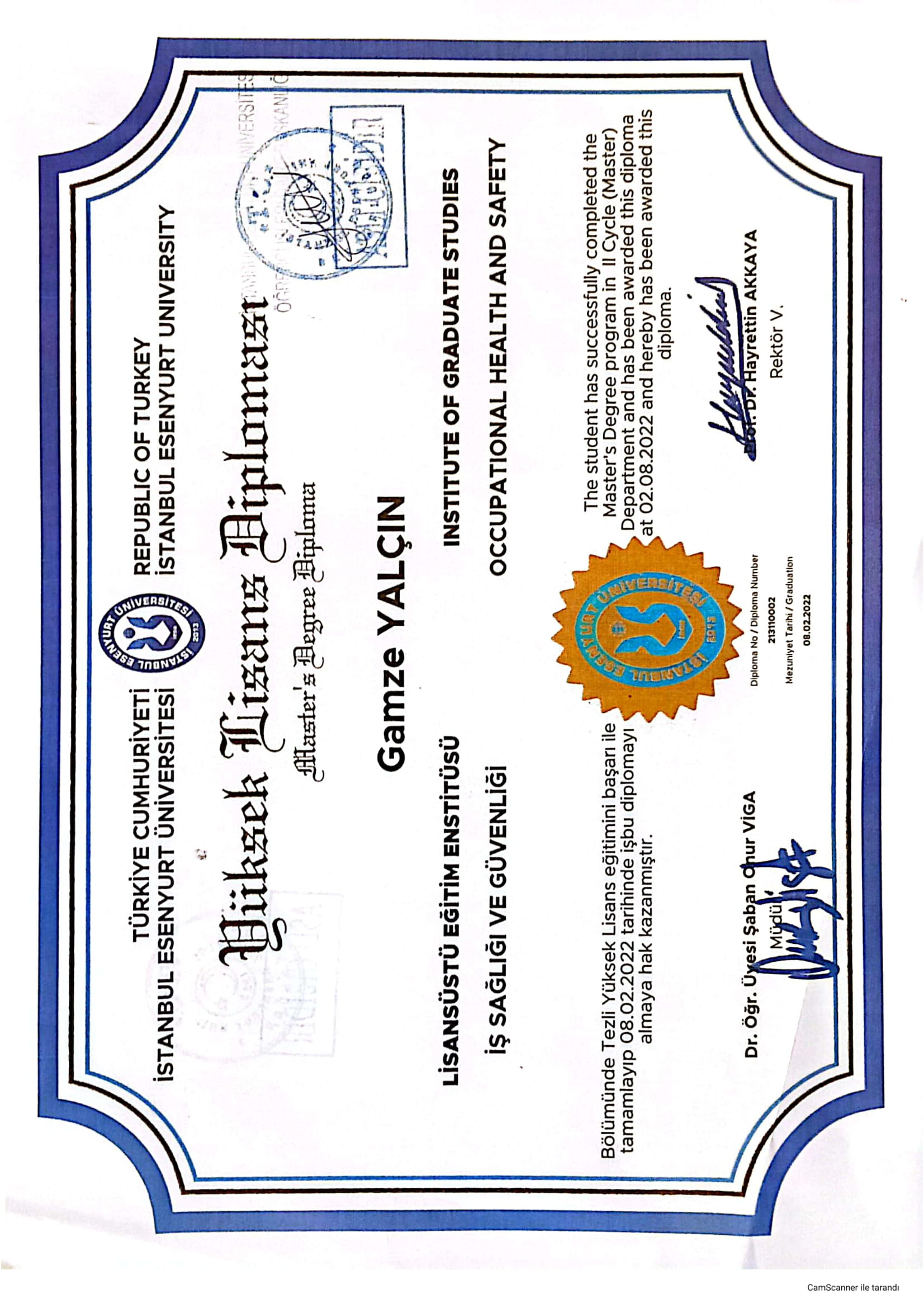 Gamze Yalçın Yüksek Lisans Diploması