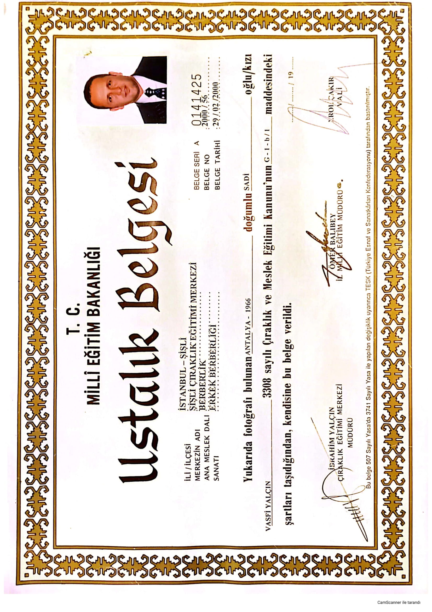 Vasfi Yalçın Erkek Berberliği Ustalık Belgesi