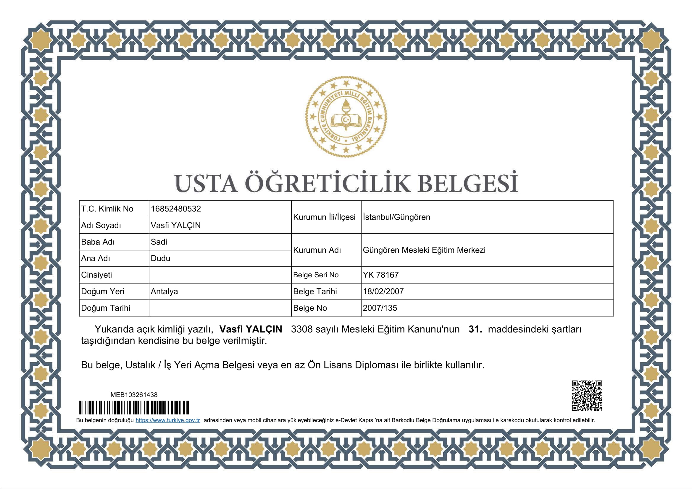 Vasfi Yalçın Usta Öğreticilik Belgesi