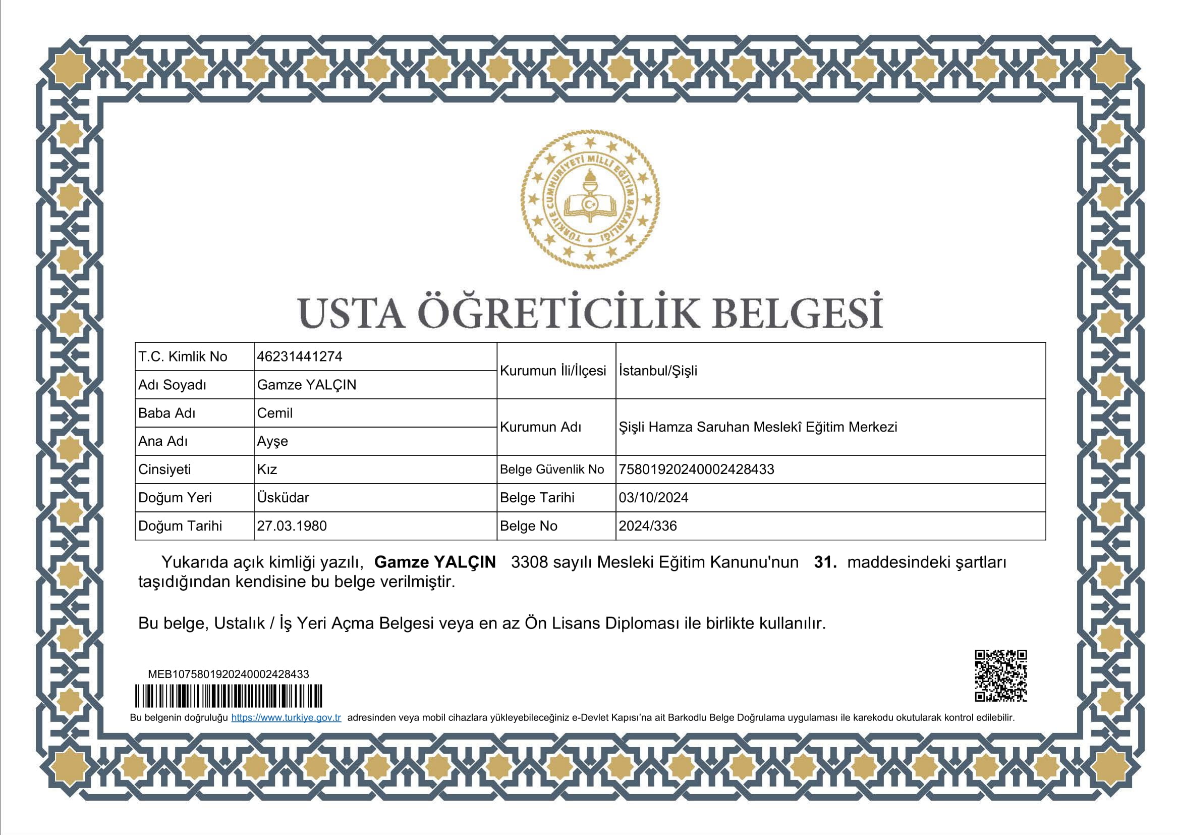 Gamze Yalçın Usta Öğreticilik Belgesi