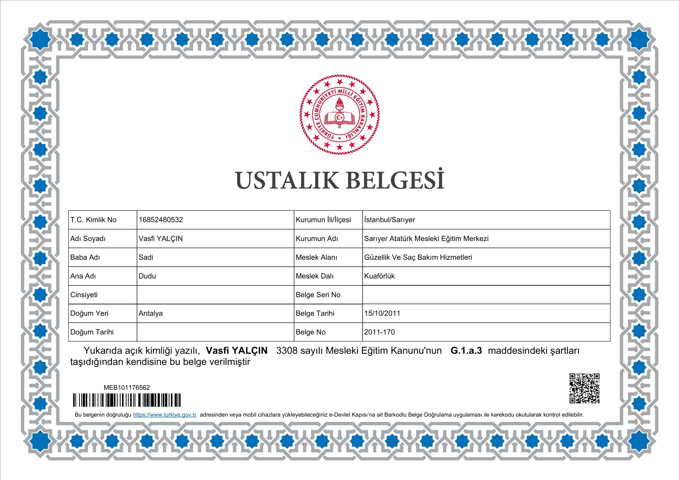 Vasfi Yalçın Erkek Berberliği Ustalık Belgesi