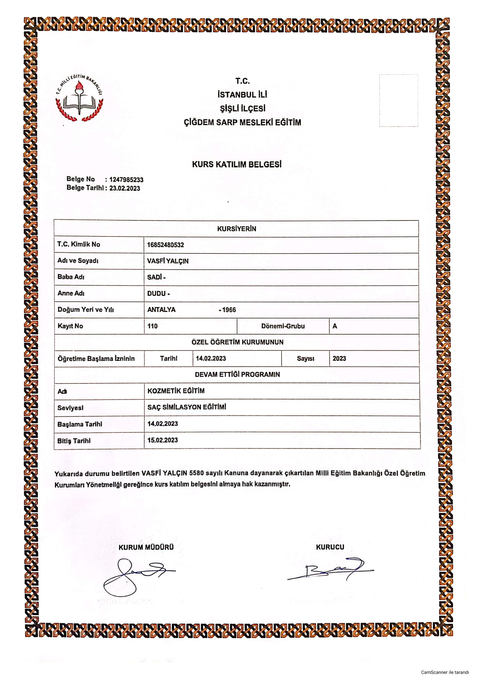 Vasfi Yalçın Kadın Kuaförlüğü Ustalık Belgesi